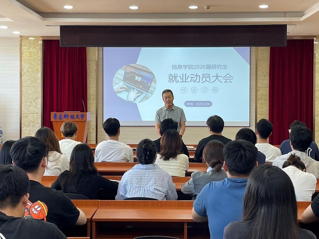 于9月25日下午在402报告厅举行2026届研究生就业动员大会。学院党委副书记兼副院长严增兴作动员讲话,研究生辅导员屈会奇主持会议,学院2023级研究生同学参加。