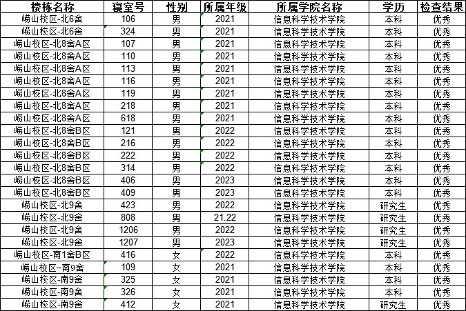 为进一步加强学生宿舍内务卫生和安全文明创建,强化学生宿舍安全意识,营造一个安全舒适、整洁优雅、文明和谐的宿舍环境。5月15日,学生工作处、后勤管理处及各学院开展了学生宿舍卫生安全秩序大检查。本次共抽查免费成人网 宿舍148间,24间宿舍获评“优秀宿舍”,优秀率16.22%,合格宿舍124间,合格率83.78%,无不合格宿舍。优秀宿舍详见名单。