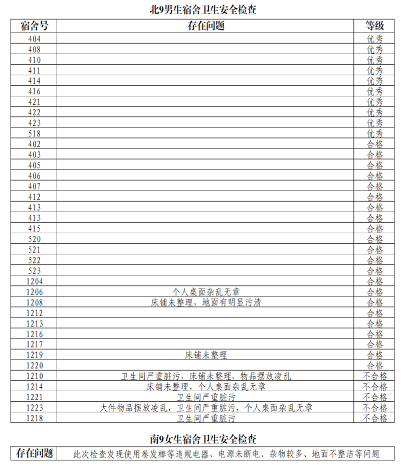 为深入贯彻落实上级关于安全工作的指示精神,加强学生宿舍内务卫生和安全文明创建,强化学生宿舍安全意识,营造一个安全舒适、整洁优雅、文明和谐的宿舍环境。4月10日,学院分管领导、学院研究生会开展了学生宿舍卫生安全秩序大检查。本次共抽查研究生宿舍37间,经统计,优秀宿舍10间,合格宿舍22间,不合格宿舍5间。